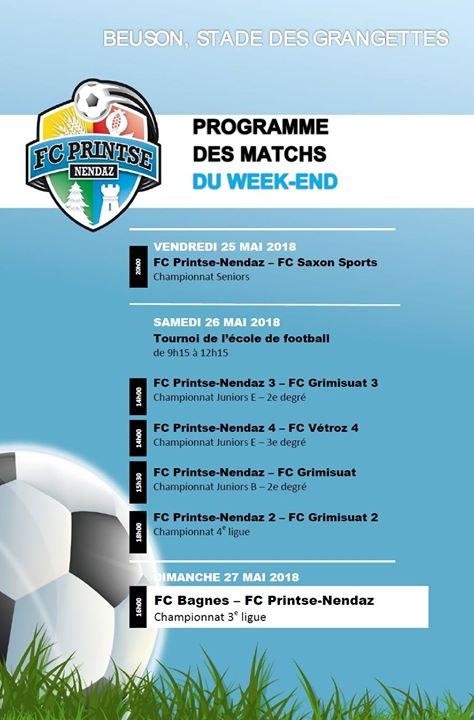 Le FC Printse-Nendaz organise ce samedi un tournoi de l'école de foot avec 16 équipes de juniors présentent à Beuson à partir de 9h15.